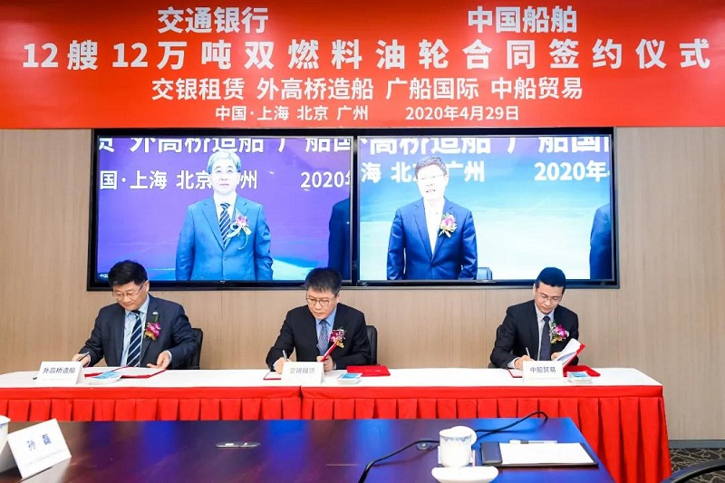 4月29日,中国船舶集团有限公司旗下中国船舶工业贸易有限公司、上海外高桥造船有限公司、广船国际有限公司与交通银行股份有限公司旗下交银金融租赁有限责任公司在北京、上海、广州三地以“云签约”方式签署12艘12万吨双燃料油船建造合同,合同总金额约46亿元人民币,这是中国船舶集团旗下单位近期承接的又一单笔大额订单。中国船舶集团党组书记、董事长雷凡培,交通银行党委书记、董事长任德奇,中国船舶集团党组成员、副总经理孙伟,交通银行党委委员、副行长吕家进出席签约仪式。