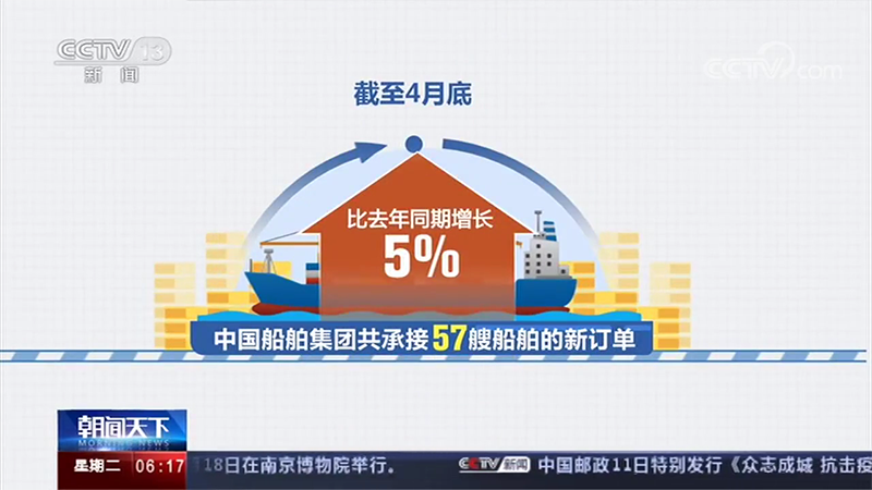 截至4月底,中国船舶集团共承接57艘船舶的新订单,比去年同期增长5%。