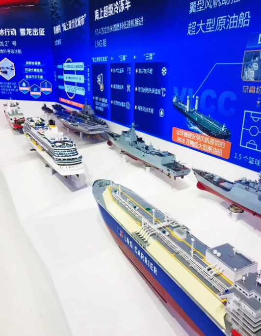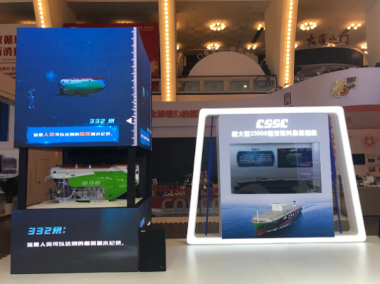 这次中国船舶集团展区以“向海图强,创新引领”为主题,以“全面建设世界一流船舶集团”的战略目标和“引领行业发展、支撑国防建设、服务国家战略”的企业使命为主线,围绕具有代表性、突破性、标志性、引领性的自主品牌,以及高质量装备和工程项目,全面展示集团公司在稳定经济发展、带动科技创新、服务民生保障、推动中国制造走向世界进程中所取得的成就。