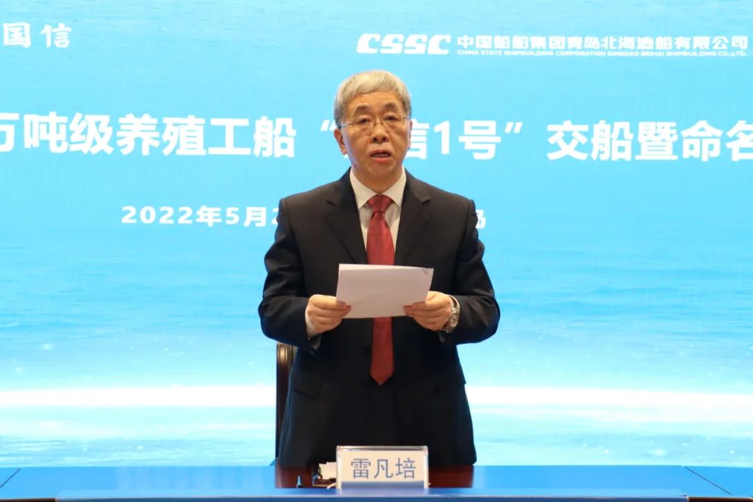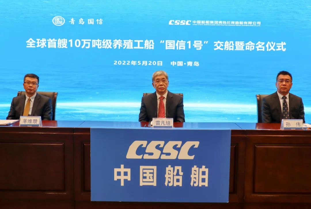 5月20日,中国船舶集团旗下青岛北海造船有限公司为青岛国信发展(集团)有限责任公司建造的全球首艘10万吨级智慧渔业大型养殖工船“国信1号”交船命名仪式在青岛举行。中国船舶集团党组书记、董事长雷凡培,党组成员、副总经理孙伟通过视频出席仪式,山东省人民政府党组成员、副省长凌文,青岛市委副书记、市长赵豪志,中国海洋大学党委副书记、校长于志刚,中国工程院院士麦康森等领导和嘉宾出席仪式。青岛市副市长赵燕为新船命名。