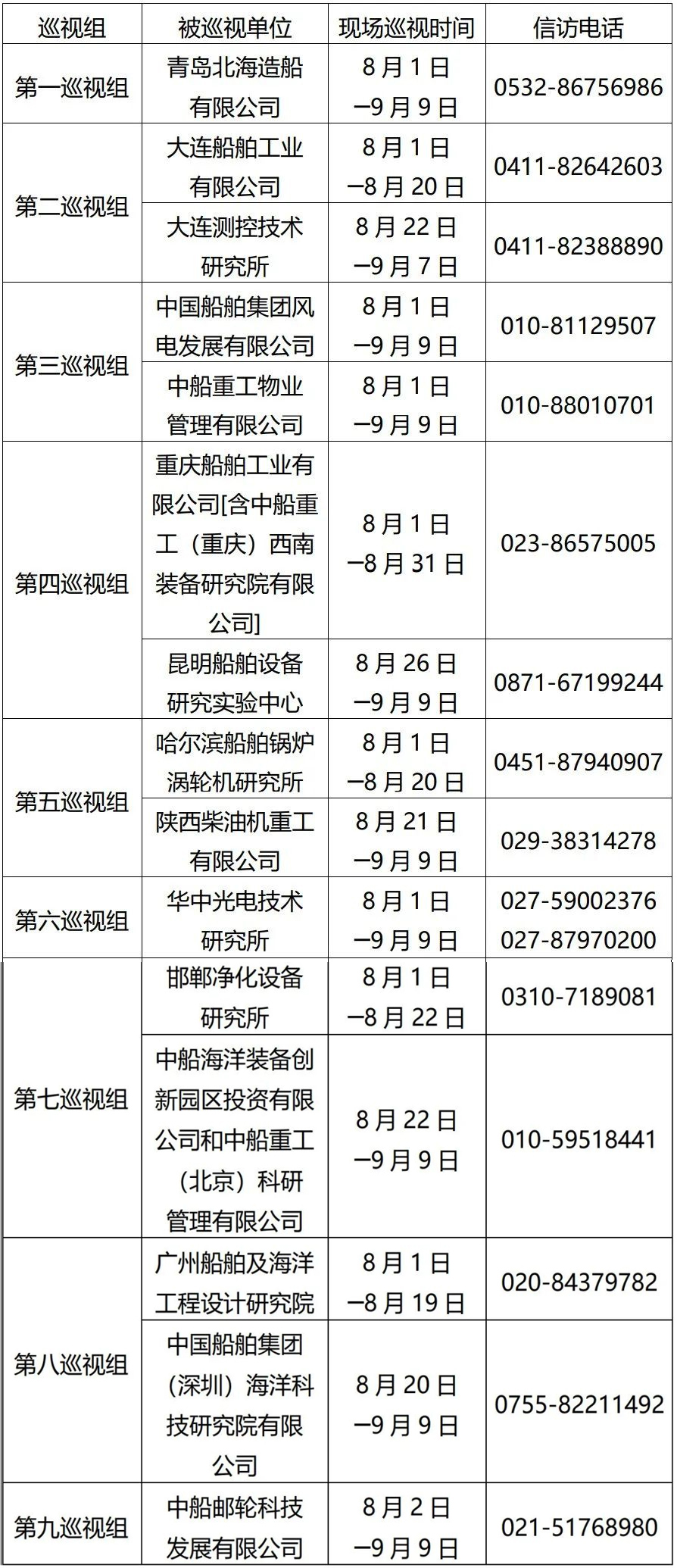 根据中国船舶集团党组2022年第一轮巡视工作部署,截至2022年8月2日,中国船舶集团党组9个巡视组已进驻青岛北海造船有限公司、大连船舶工业有限公司、中国船舶集团风电发展有限公司、中船重工物业管理有限公司、重庆船舶工业有限公司[含中船重工(重庆)西南装备研究院有限公司]、哈尔滨船舶锅炉涡轮机研究所、华中光电技术研究所、邯郸净化设备研究所、广州船舶及海洋工程设计研究院、中船邮轮科技发展有限公司等单位,对其党组织开展为期40天左右的现场巡视。巡视期间,巡视组设置专门值班电话(具体如下表)。同时在巡视组工作现场设置联系信箱,广大干部职工可以反映情况。