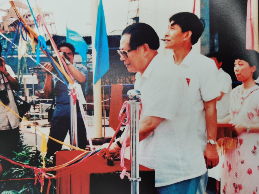 1986年,江泽民同志为江南造船65000吨原油轮“柳河”号下水剪彩。