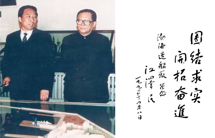 1990 年4月8日,江泽民同志视察渤海造船厂并题词“团结求实,开拓奋进”。