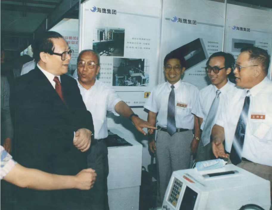 江泽民同志曾参观系统工程研究院、中船电科旗下海鹰公司产品。图为1995年,江泽民同志参观海鹰公司展台。