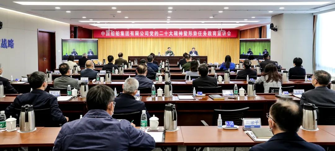 1月30日,中国船舶集团有限公司召开党的二十大精神暨形势任务教育宣讲会,动员集团上下全面准确领会党的二十大精神,深刻认识当前世界百年未有之大变局,更好把握当前国际国内形势,进一步团结带领广大干部职工踔厉奋发、勇毅前行,加快推进世界一流船舶集团建设。中国船舶集团党组副书记、总经理杨金成主持会议,党组副书记、董事杜刚,党组成员、副总经理孙伟,纪检监察组组长、党组成员李佳颖,党组成员、总会计师贾海英,党组成员、副总经理盛纪纲出席会议。会议邀请十三届全国政协常委、提案委员会副主任,中央军委联合参谋部原上将副总参谋长戚建国作宣讲报告。