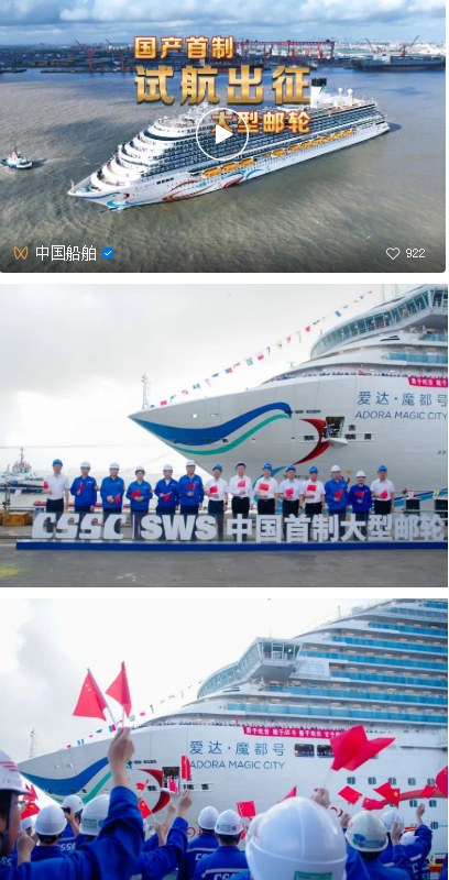 “我宣布,中国首制大型邮轮试航出征!”