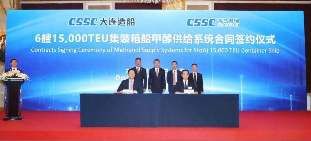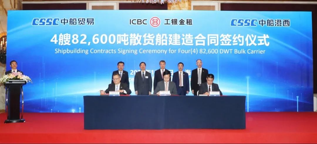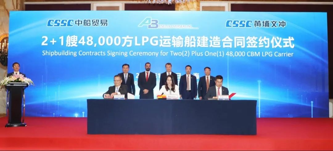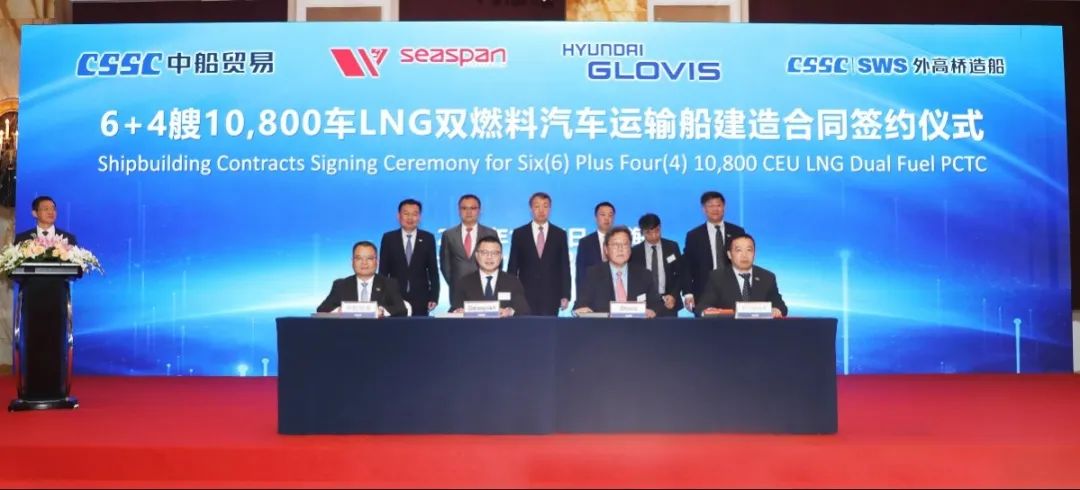 签约仪式上,外高桥造船、中船贸易与Seaspan、现代Glovis签署了6+4艘10800车LNG双燃料PCTC船项目;广船国际、中船贸易与HMM、现代Glovis签署了6+4艘10800车LNG双燃料PCTC船项目;北海造船、中船贸易与北银金租、山东海运签署了4艘325000吨超⼤型甲醇双燃料矿砂船项目;江南造船、中船贸易与太平洋气体签署了3艘99000方VLEC船项目;黄埔文冲、中船贸易与Benelux公司签署了2+1艘48000方LPG船项目;中船澄西、中船贸易与工银金租签署了4艘82600吨散货船项目;大连造船与七二五所青岛双瑞签署了15000TEU集装箱船甲醇供应系统项目。