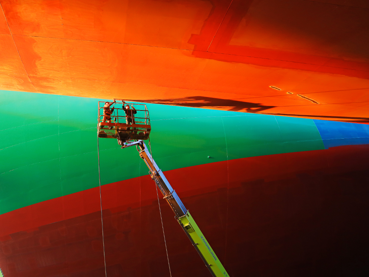 两位打磨工人驾驶高空车对外板进行清洁施工,这个瞬间,他们如同置身于童话当于一般。