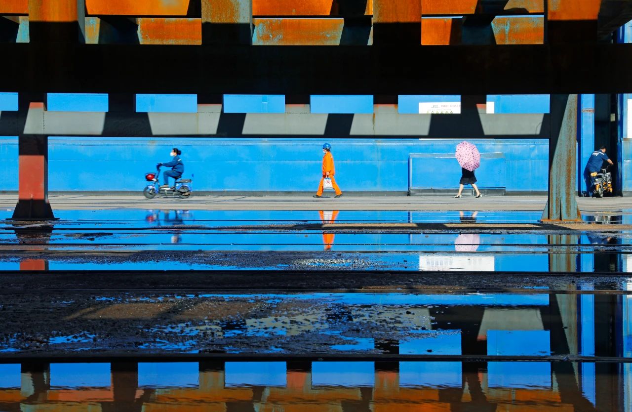 夏日清晨,一场大雨过后空气透亮清新,厂区高跨门口服装各异的职工行走在上班的路上,空地上摆放的工装架与其自身的投影形成了独特的画框,让画面中行走的职工虽小却很突出,起重工亮橙色的服装、撑起的雨伞与明亮的蓝色跨门形成色彩对比,使画面活泼跳跃,职工们形形色色又从容有序,勾勒出厂区一隅的美丽风景。