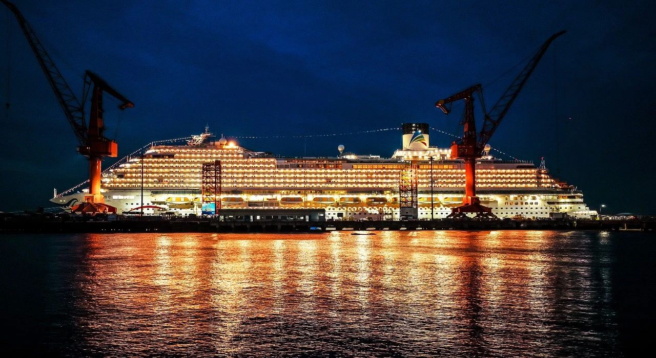 国产首艘国产大型邮轮“爱达·魔都号”,停靠在长江口,灯光电路测试期间,华灯绽放恍如白昼。
