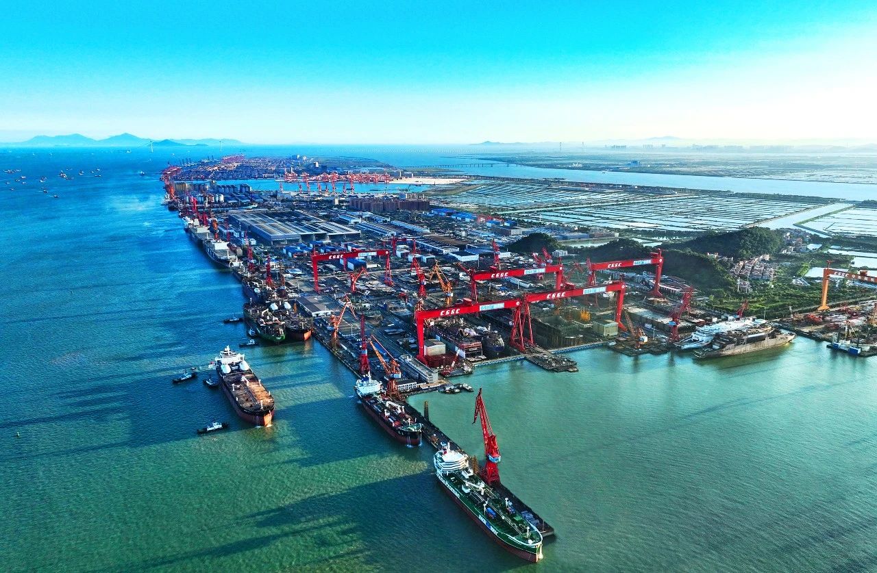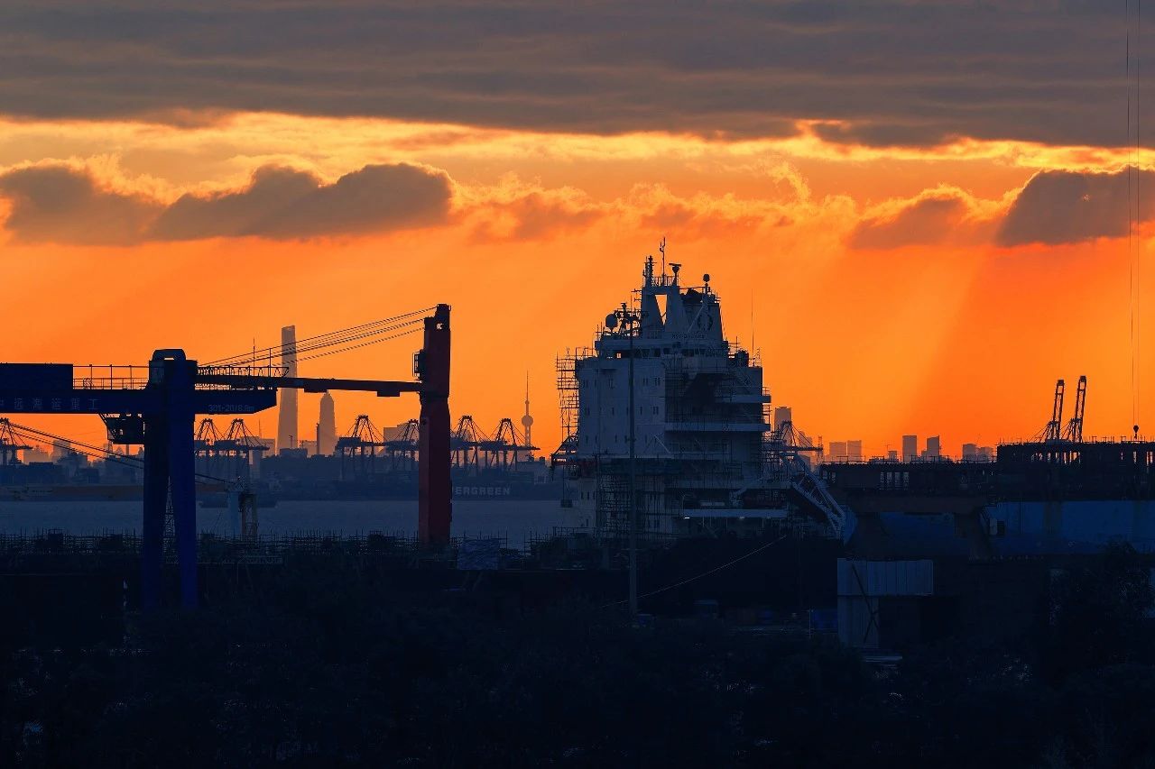 落日余晖下,造船现场灯火通明,展现出一派繁忙景象。在五彩斑斓的晚霞衬托下,整个造船基地犹如宝石般熠熠生辉。