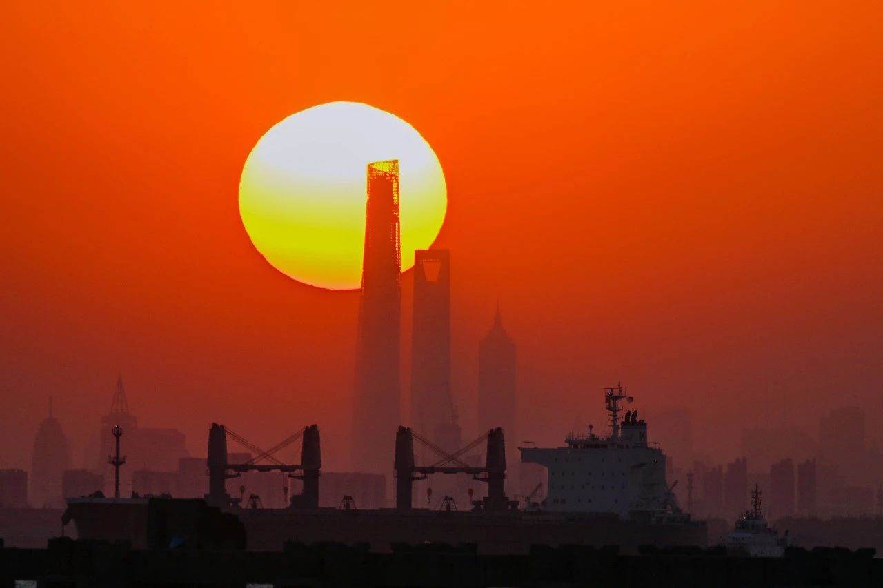 从距离陆家嘴33公里远的横沙岛上远眺“三件套”,夕阳从“三件套”穿过,此时一艘船驶入画面,与夕阳形成近中远三景。