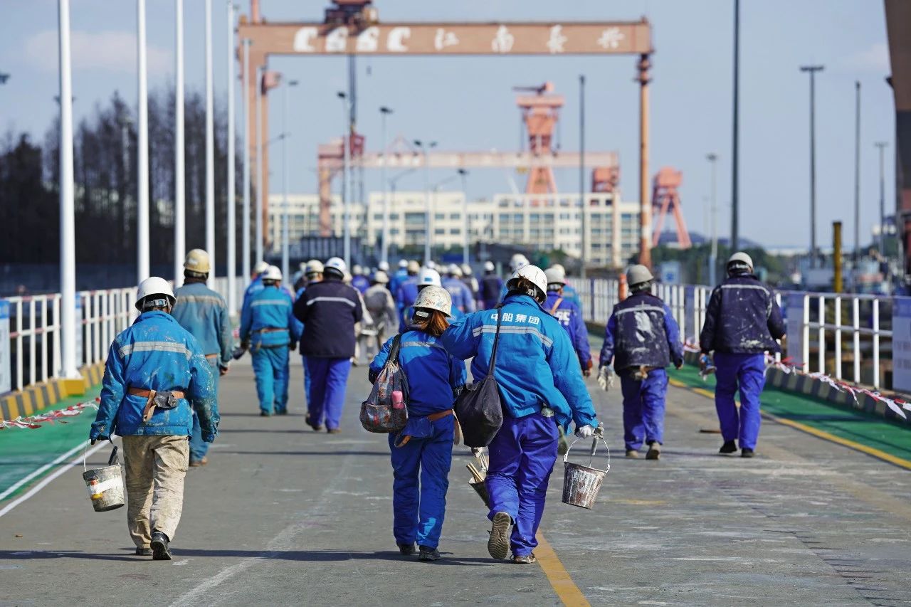 在码头上,午休时间,一线工人拎着工作工具,互相交谈着,亦或是搭着肩膀,一起下班。