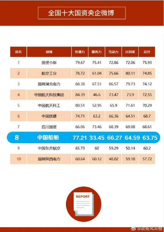1月31日,由微博出品,人民网舆情数据中心、人民网数据研究院提供学术支持的“2023年度政务微博影响力报告”发布。“中国船舶”微博登上“全国十大国资央企微博”榜单,这是“中国船舶”微博第三次进入“全国十大国资央企微博”排行榜。