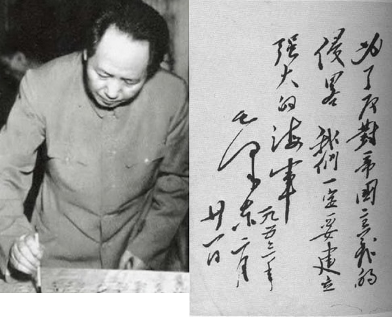 1953年,毛泽东同志视察“长江”舰,在舰上挥毫写下“为了反对帝国主义的侵略,我们一定要建立强大的海军”。