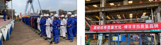 中船澄西组织各部门、车间举行质量誓师大会、质量承诺签名等活动,进一步强化全员“质量至上”意识,将质量责任落在笔下、放到心中。质量部牵头开展工程承包商质量管理体系运行“回头看”专项检查活动,通过“把脉体检”,促进施工“主力军”不断规范质量管理工作,以管理能力提升促进质量工作提高。