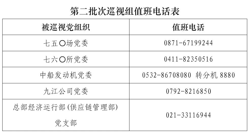 巡视期间,集团公司党组巡视组设置值班电话和联系信箱,主要受理反映被巡视党组织领导班子及其成员、下一级党组织领导班子主要负责人和重点岗位领导干部问题的来信、来电、来访,重点关注违反政治纪律、组织纪律、廉洁纪律、群众纪律、工作纪律、生活纪律以及巡视整改等方面问题反映。第二批次巡视受理信访截止时间为8月18日。