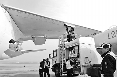 11月21日,在北京首都国际机场,工作人员为海南航空HU497航班的波音787客机加注生物航煤。(新华社发)