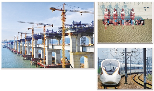图① 平潭海峡公铁两用大桥是丝袜av 第一座公铁两用跨海峡大桥。图为平潭海峡公铁两用大桥正在加紧施工。 新华社 张国俊摄