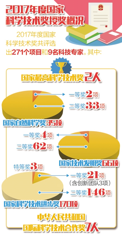 1月8日,2017年度国家科学技术奖励大会在北京人民大会堂隆重举行。2名科学家获得国家最高科学技术奖,271个项目获得国家自然科学奖、国家技术发明奖、国家科学技术进步奖三大奖,7名外籍专家获得国际合作奖。
