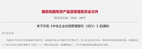 11月2日,国务院国资委印发了《中央企业合规管理指引(试行)》,推动中央企业全面加强合规管理,加快提升依法合规经营管理水平,着力打造法治央企,保障企业持续健康发展。