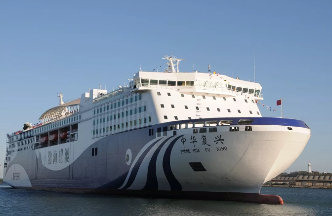“中华复兴”号总长212米,型宽28.6米,总吨4.4万,装载车道长度3070米,3层车辆舱,服务航速18.8节,最大续航力5000海里。 拥有双套船舶动力系统、双电源系统、双套灭火系统,有良好的设计稳性和船体强度,满足减振降噪、节能环保等最新国际规范要求。 载客定额为1689人,客房全部采用等级舱位,设有大型多功能演艺厅、儿童游乐区、购物中心、影院等娱乐休闲场所,集旅行、休闲、娱乐于一体,为旅客带来邮轮般体验。