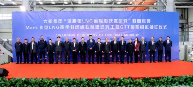 2019年11月26日,大船集团举行“薄膜型LNG运输船技术研究”科研专项MarkⅢ型LNG船全封闭模拟舱建造完工暨GTT和船级社颁证仪式。法国GTT公司、英国劳式船级社和中国船级社代表在模拟舱建造现场向大船集团代表颁发证书。