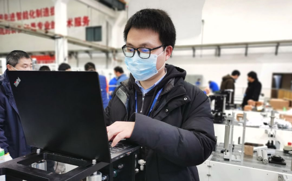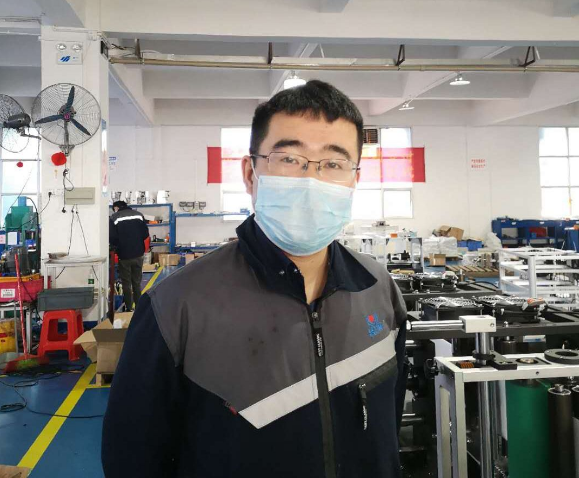 徐存培是平面口罩机项目的技术负责人。自接到平面口罩机研制任务以来,他几乎就“长”在公司里了。他穿梭在各台平面口罩机间,一会儿垫脚测量放料架距离地面的高度,一会儿弯腰拧紧设备柜里的螺丝,一会儿又紧盯着传送带,看无纺布贴合的角度是否精准无误……