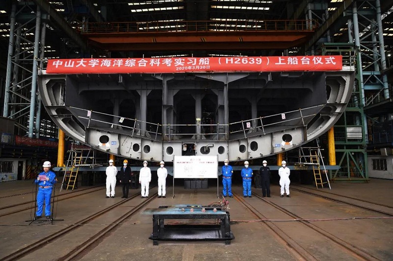 3月30日,由中国船舶集团七〇八所设计、江南造船建造的中山大学海洋综合科考实习船顺利上船台。该型船是国内目前最大的海洋综合科考船,总长约114.3米,排水量约6800吨,续航力15000海里,入级中国船级社(CCS);具备B3冰级加强,采用直流母排+蓄电池储能技术,配有齿轮全回转主推进装置、轮缘永磁侧推装置,具备DP1动力定位能力,是一艘配置高、能力强、创新技术高度集成的新一代大型海洋综合科考船。