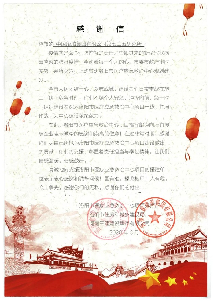近日,中国船舶集团七二五所收到洛阳市医疗应急救治中心项目指挥部发来的感谢信,中国船舶集团旗下江苏自动化研究所向英国合作单位寄送慰问函与防疫物资。洛阳市医疗应急救治中心项目指挥部,对七二五所在新冠肺炎疫情期间支援建设,洛阳市医疗应急救治中心项目建设作出的贡献表示感谢。