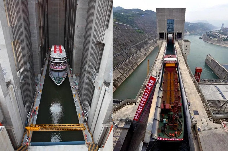 三峡升船机(左)是目前世界上技术难度和规模最大的升船机,向家坝升船机(右)是目前世界上已投入运行中提升高度最大的升船机