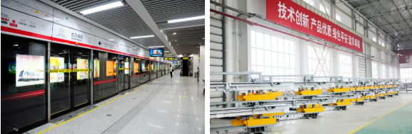 左图:郑州地铁1号线使用七一三所轨道交通站台门系统;右图:七一三所轨道交通站台门门机系统生产现场