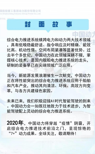 4月29日,就在今天 中国船舶集团旗下中国动力 2019年报重磅发布 读取报告全文 欢迎点击“阅读报告” 或长按识别下方二维码 2020年,中国动力将穿越疫情阴霾 开启综合电力推进技术前沿之门 呈现惊艳的“7+”动力成果 全球关注,敬请期待!