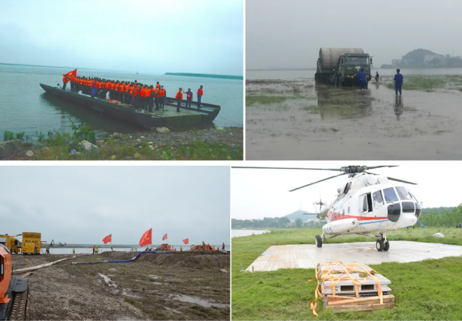 在搜救环节,中船应急抢险队架设动力舟桥和硬质机动路面进行道路抢通,保障重型装备及人员进场;在内涝抢排环节,采用应急泄流虹吸装备和履带式排涝机器人参与排涝抢险;在重大险情处置环节,铺设应急直升机停机坪保障直升机起降,并实施溃口封堵作业。