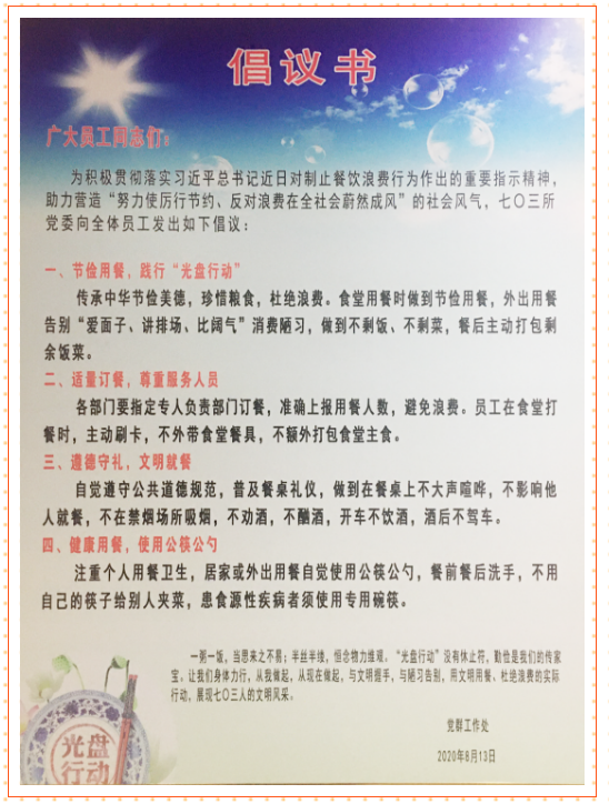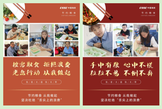 连日来,中国船舶集团多家成员单位积极践行习近平总书记对制止餐饮浪费行为的重要指示精神,进一步加强宣传教育,培养节约习惯。首先刊载有特色的宣传海报、条幅,