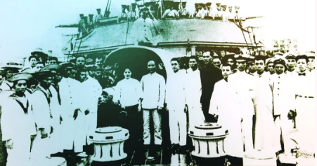 △1923年,孙中山与靠泊黄埔船厂的永丰舰(后更名为中山舰)官兵合影