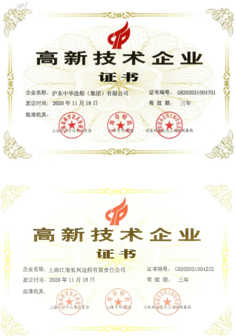 日前,中国船舶集团旗下沪东中华及其控股公司上海江南长兴造船有限责任公司双双收到了由上海市科学技术委员会、上海市财政局、国家税务总局上海市税务局联合颁发的高新技术企业证书。