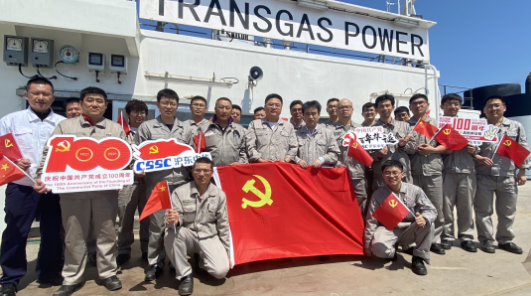 4月6~12日,在国内首款大型LNG-FSRU首制船试航期间,沪东中华试航团队22名党员、团员多次开展党史学习教育。