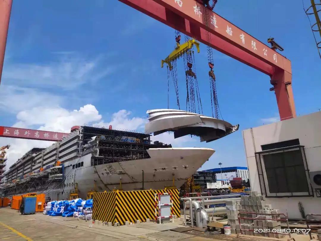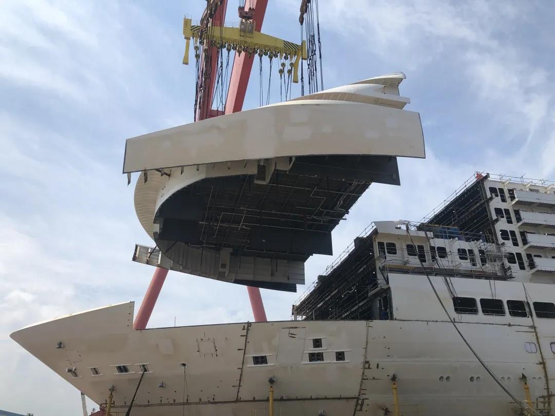 这标志着国产首制大型邮轮正式开启艏部吊装模式,9月份将实现全船结构贯通这一里程碑节点。