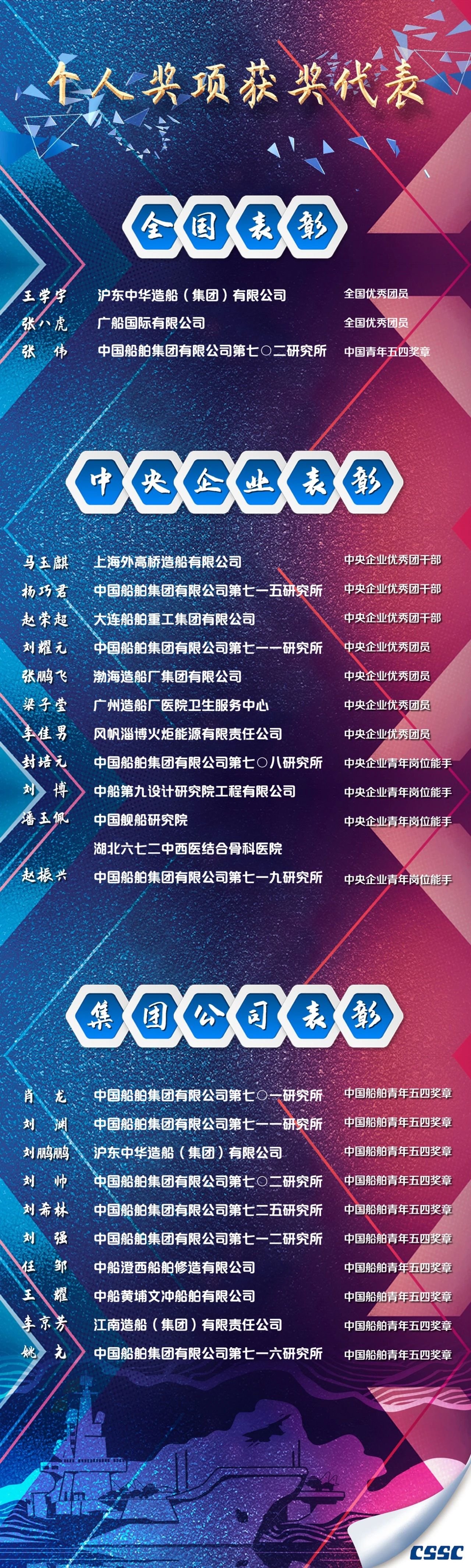 有的在生产一线不畏艰难、埋头苦干,有的在服务集团发展的最基层不计得失、任劳任怨。他们把个人理想融入世界一流船舶集团的伟大事业中,书写着新时代的青春答卷,彰显着新时代青年的责任与担当,为船舶青年作出了榜样,树立了标杆。