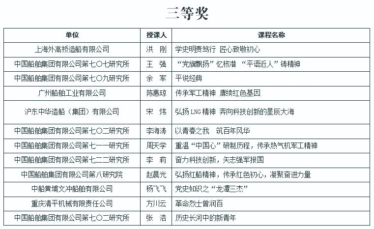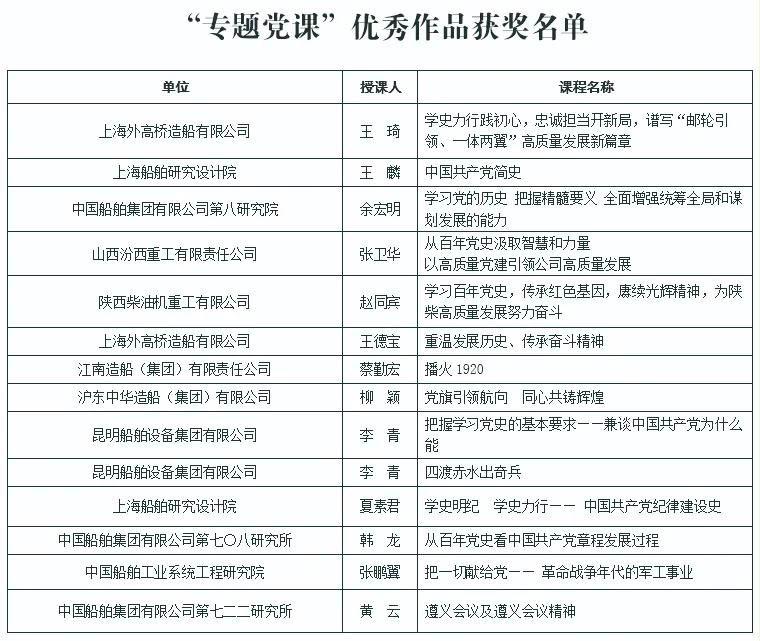 为庆祝中国共产党成立100周年,深入推进党史学习教育,由中国船舶集团党群工作部主办,中国船舶集团党校承办的庆祝中国共产党成立100周年党课评选活动结果今天正式揭晓。