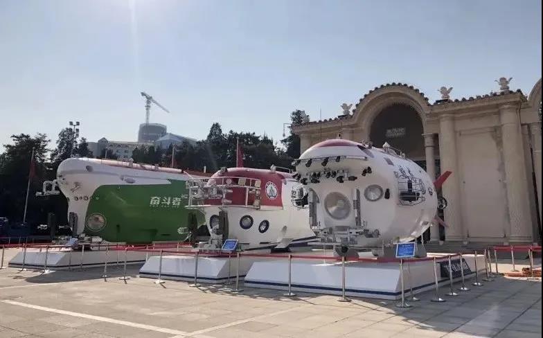 屹立展馆外场的“蛟龙”号、“深海勇士”号、“奋斗者”号三台实尺度潜水器模型。