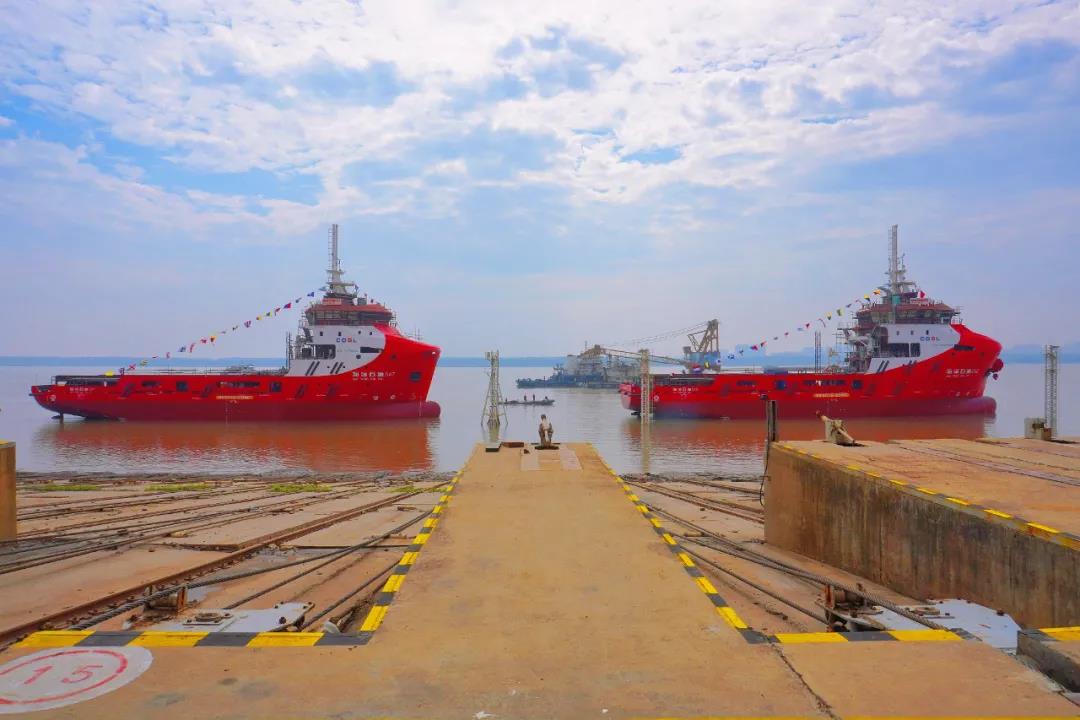 10月26日上午,中国船舶集团旗下武船集团为中海油田服务股份有限公司建造的两型4000马力LNG动力守护供应船3号船“海洋石油542”和“海洋石油547”下水。