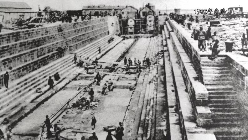 修船南坞始建于1899年,1902年底初建完工,长116米、宽13米、深7.6米,采用两开式扉门,并配备电动排水泵。