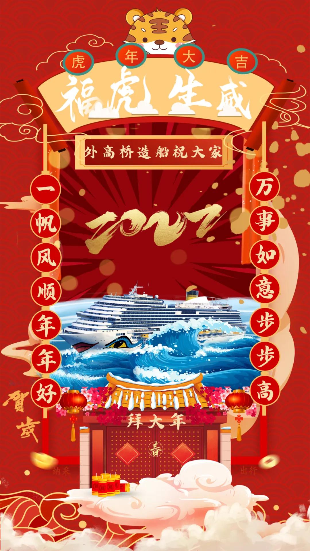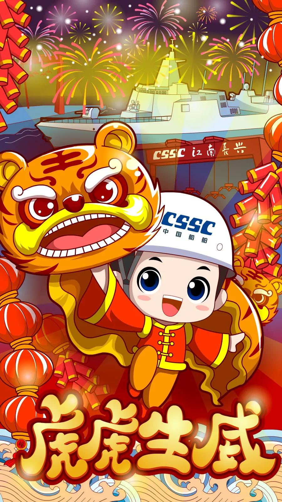 海报采用国潮画风,中间部分“江小南”穿着新衣举着虎头,寓意新的一年中国船舶人虎虎生威,上面部分以重要产品和厂区设备为主,诠释江南造船建造国之重器的初心和使命,同时辅以鞭炮、烟花、灯笼等新年元素,使海报充满喜庆祥和的新年氛围。