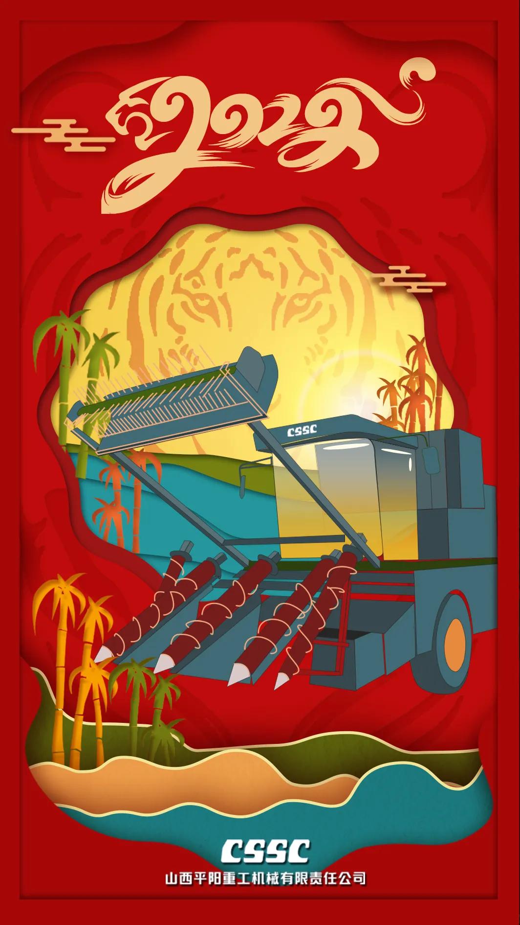 海报采用剪纸风格,层层递进的纵深感传递着平阳人不断探索创新的拼搏精神;海报主体为平阳重工新产品——甘蔗收获机,展示着平阳风采;海报以“虎纹”为背景,以红色为主色调,烘托出虎年的喜庆氛围。