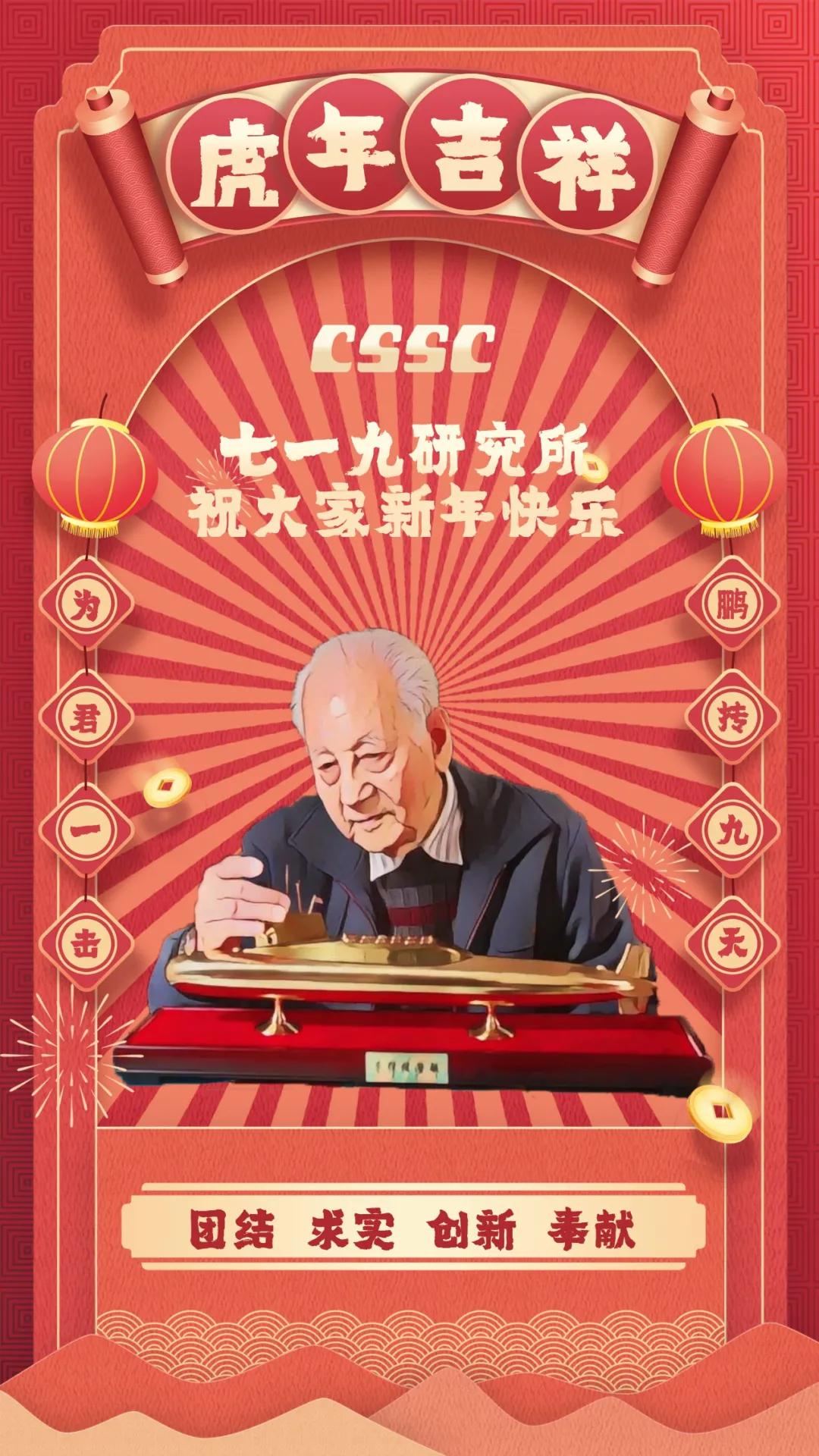 节日的烟花诠释喜庆,大红的灯笼点亮祝福!黄旭华院士作为七一九所典型人物代表,认真注视着他为之奉献一生的艇,也反映了这条战线上科技工作者们“团结、求实、创新、奉献”的工作作风。“为君一击 鹏抟九天”暗藏“一九”二字,反映出七一九所肩负的责任之大,使命之重,表达了军工人将船舶事业做大做强的决心。