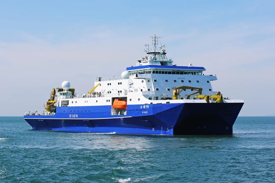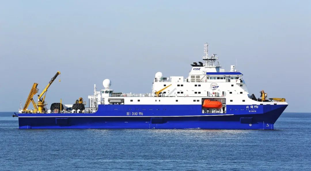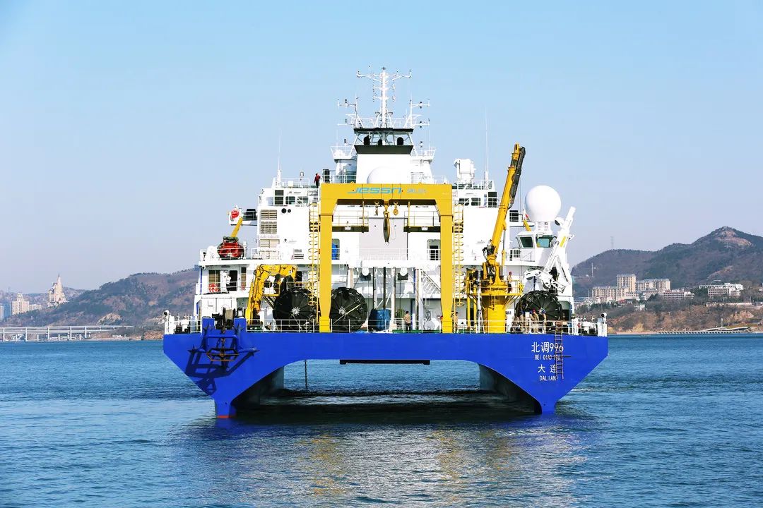 小水线面双体船是一种水线面积小,且由两个潜水体和一个水上箱体,中间有两个流线型支柱连接起来的船舶。该船型耐波性好,能够很好地解决深海作业浪大、波峰高等问题,利于在深海开展试验工作。该船于2019年8月26日开工,2021年3月20日下水,2022年3月23日完工,历时2年零7个月时间。该船总长99.8米,型宽32米,吃水7.5米,型深13.2米,航速15节,排水量6700吨。