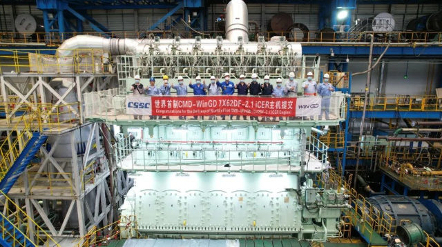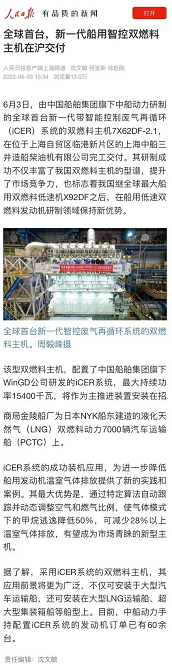 该型双燃料主机,配置了中国船舶集团旗下WinGD公司研发的iCER系统,最大持续功率15400千瓦,将作为主推进装置安装在招商局金陵船厂为日本NYK船东建造的液化天然气(LNG)双燃料动力7000车汽车运输船(PCTC)上。