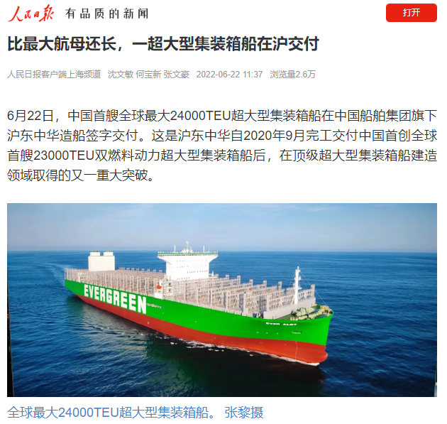 截至目前,沪东中华已交付8000TEU级以上的集装箱船近70艘,累计承接24000TEU超大型集装箱船9艘,居中国各大船企之首,目前6艘正在建造之中,年内计划交付3艘,意味着全球最大型箱船建造交付进入“沪东中华时间”,中国船舶业全球最大箱船品牌船型将结出更多硕果。